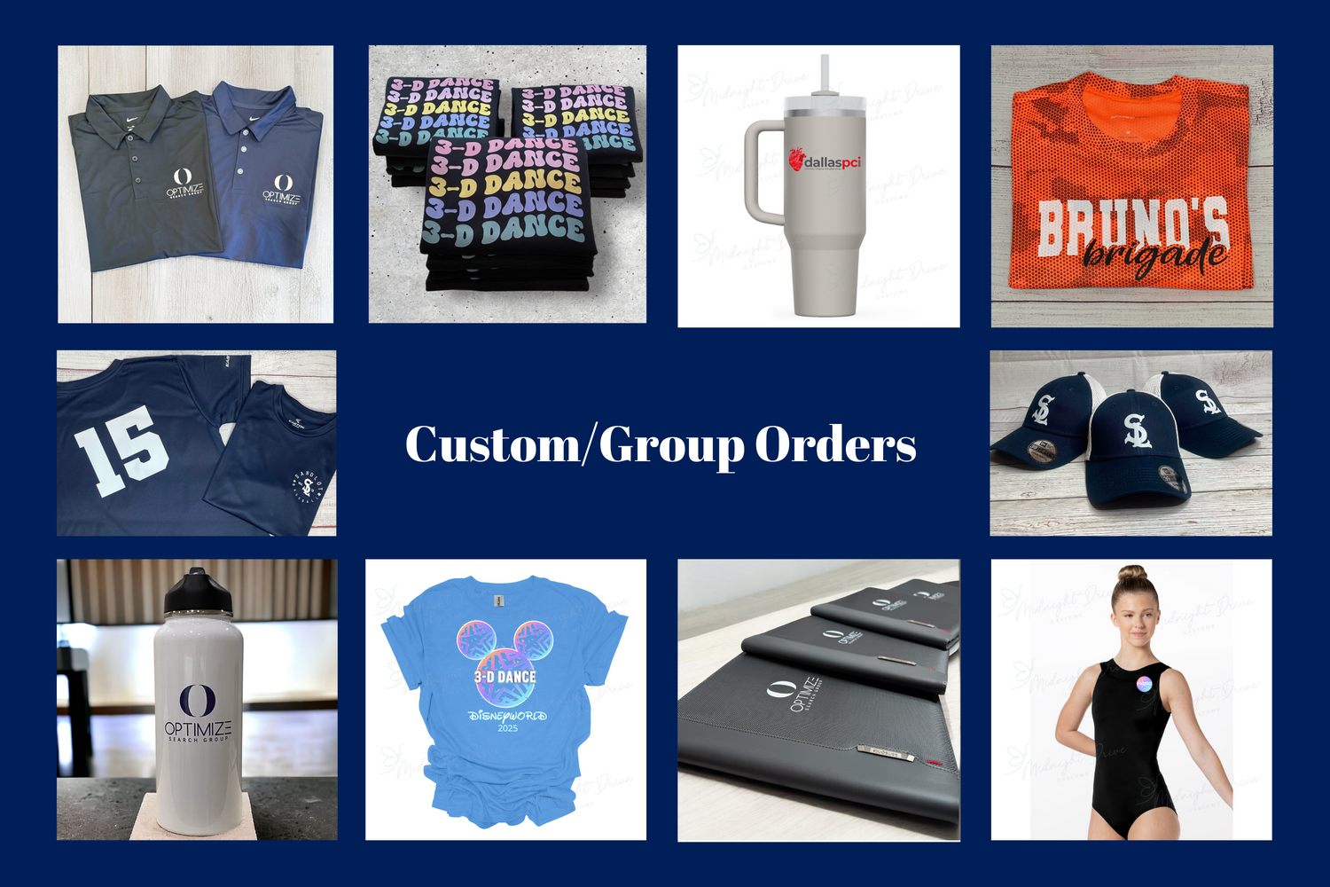 Midnight Drive Designs offers custom apparel, merch, gifts and promotional items for companies, organizations, schools, groups and individuals. We enjoy partnering with our clients for all their personalized needs! Email roxanne@midnightdrivedesigns.com for you personalized orders!