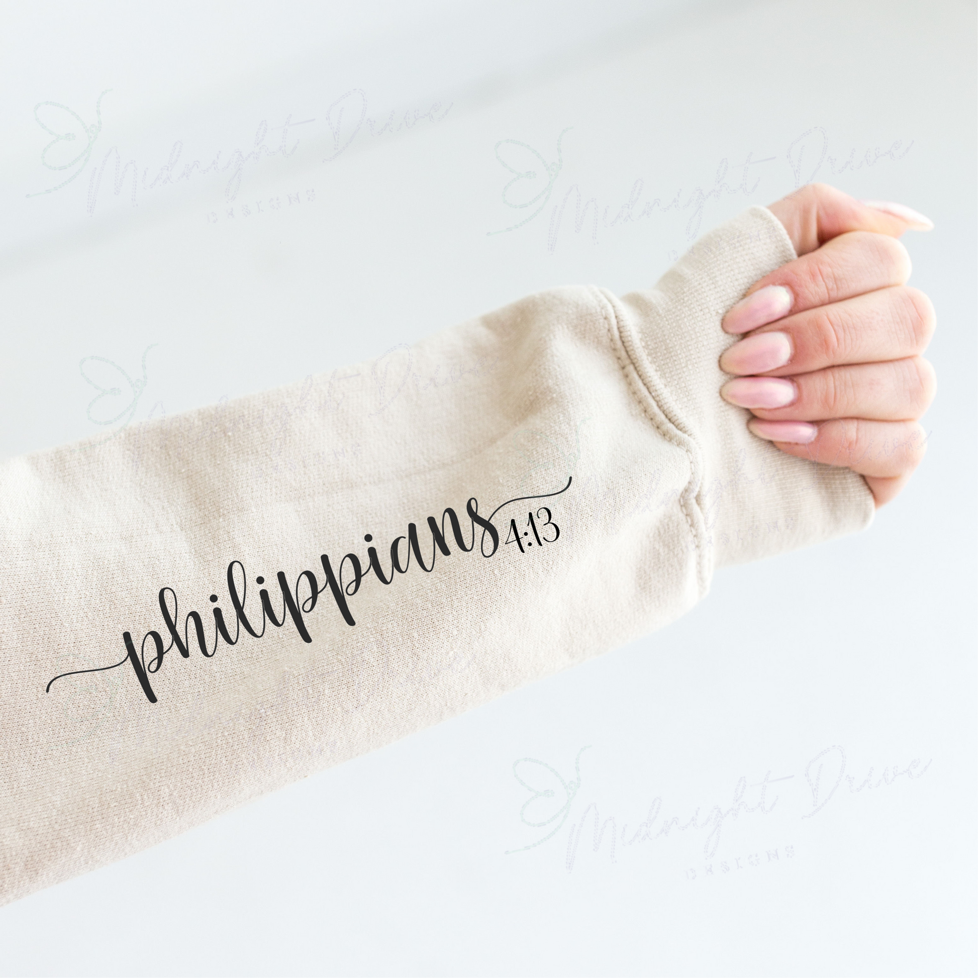 She Is Strong | Bible Verse | Unisex Sweatshirt | Unisex Long Sleeve T-Shirt | Women's Graphic Sweatshirt | Faith | Philippians 4:13 | Gift